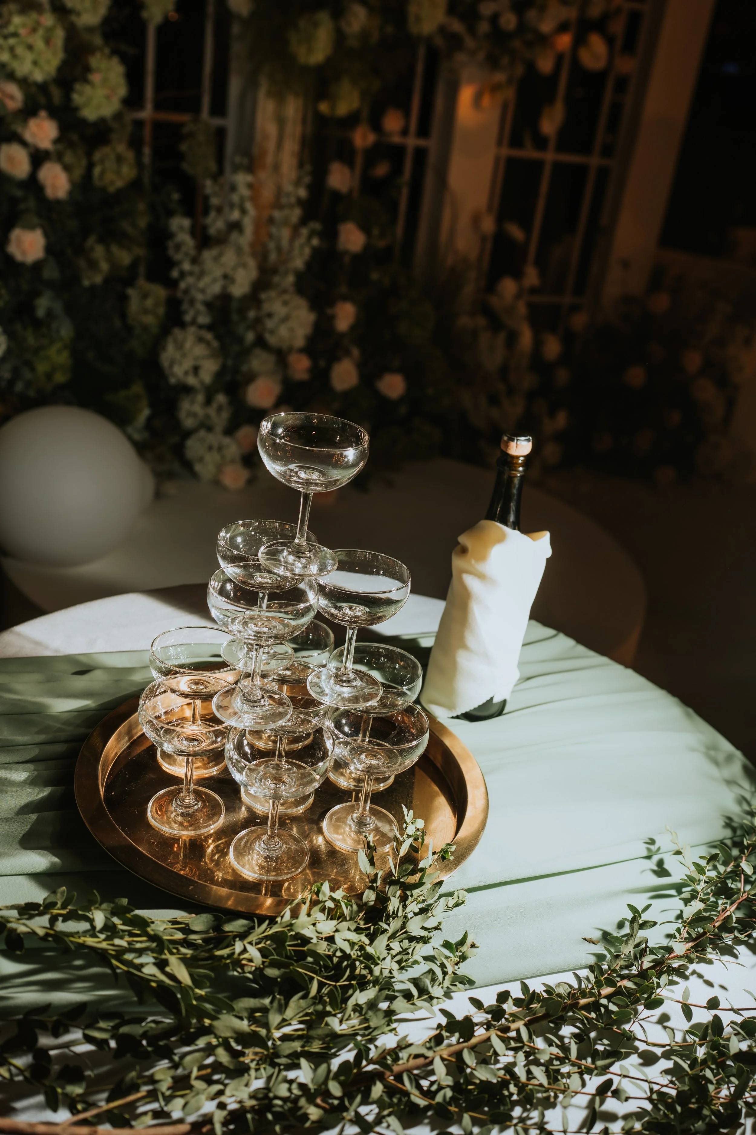 A tiered tray of empty champagne glasses on a table decorated with greenery, with a bottle wrapped in a white cloth and a decorative backdrop of flowers and plants.