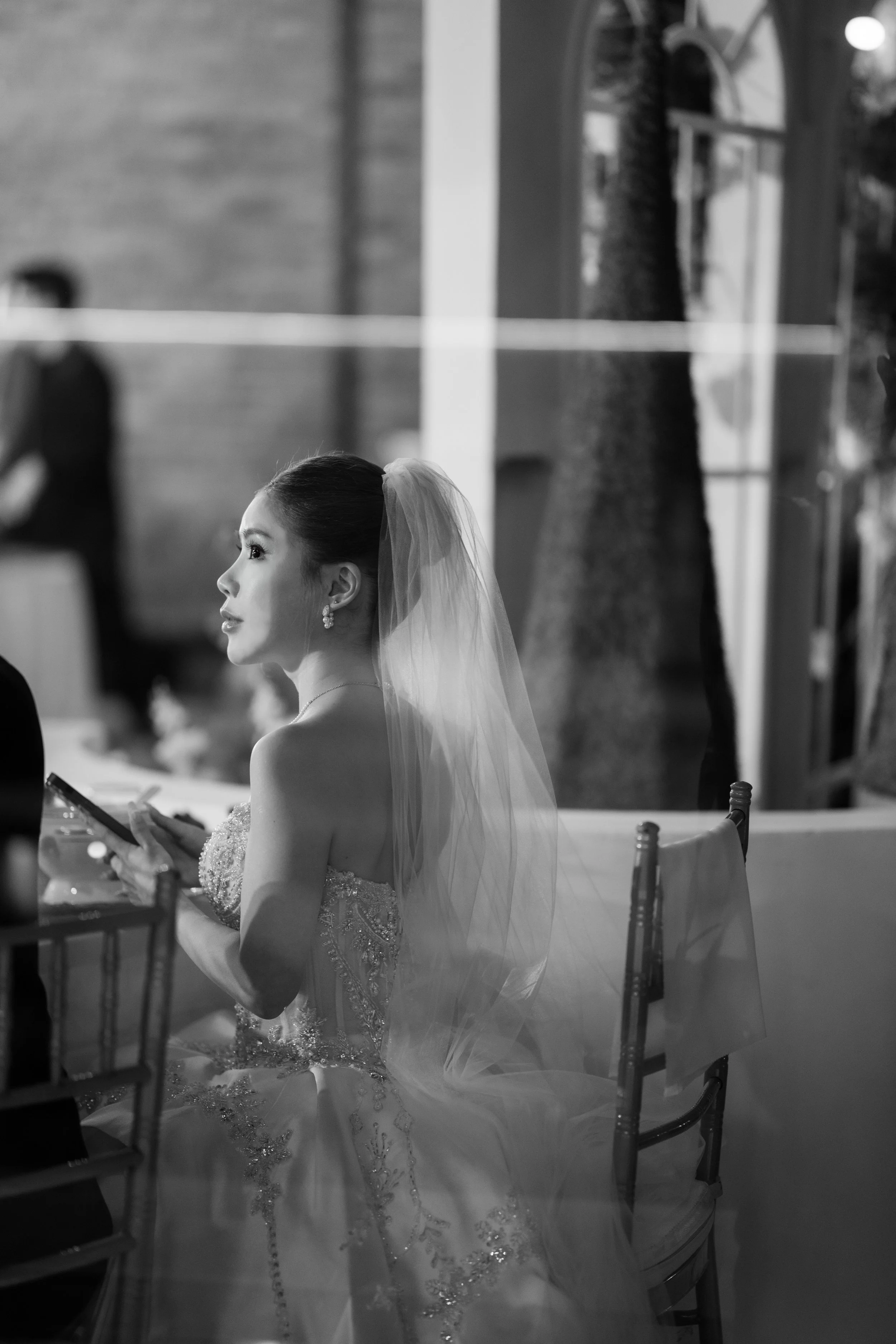 A black and white photo of a bride with a veil, sitting at a table, looking to her left, holding a phone.