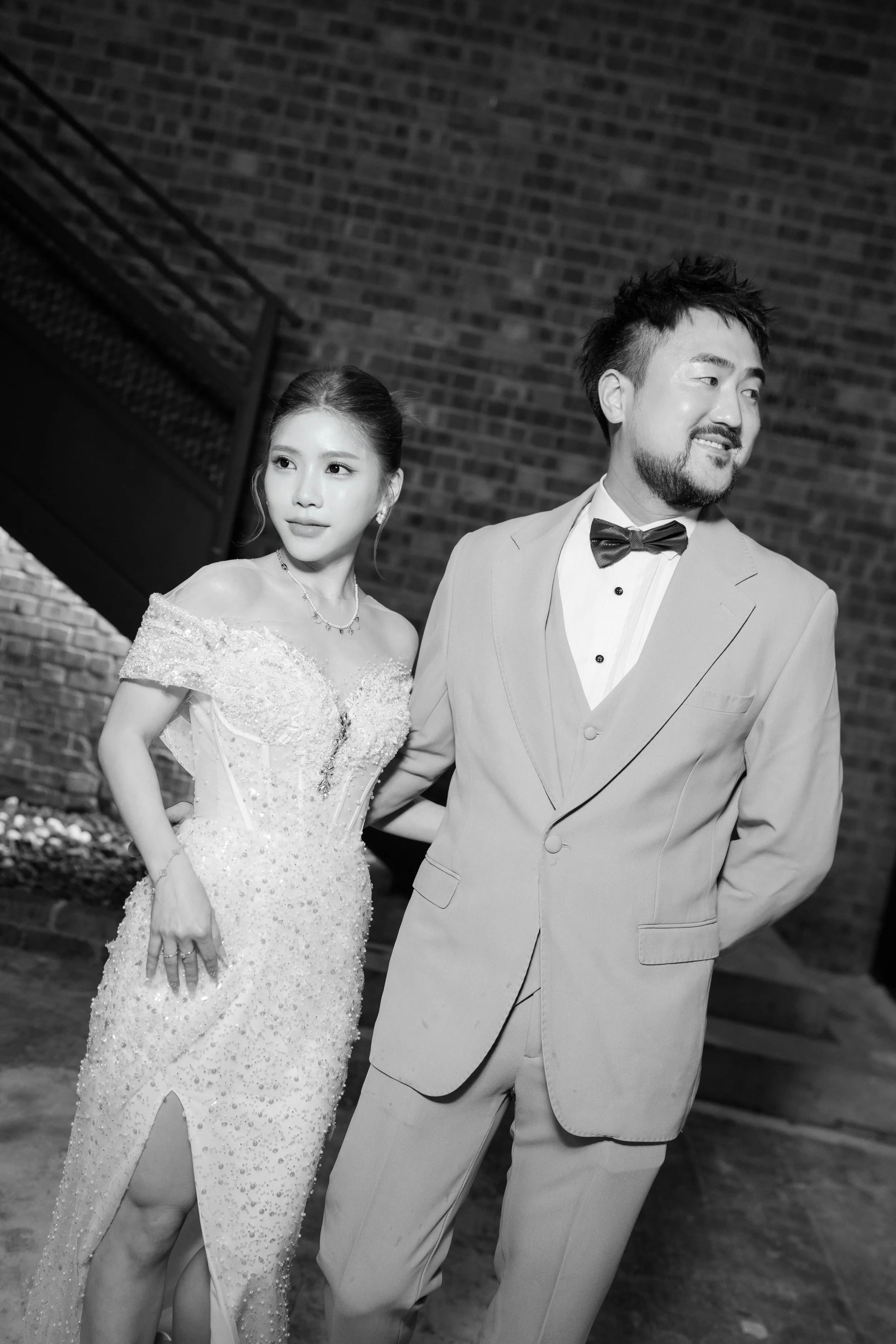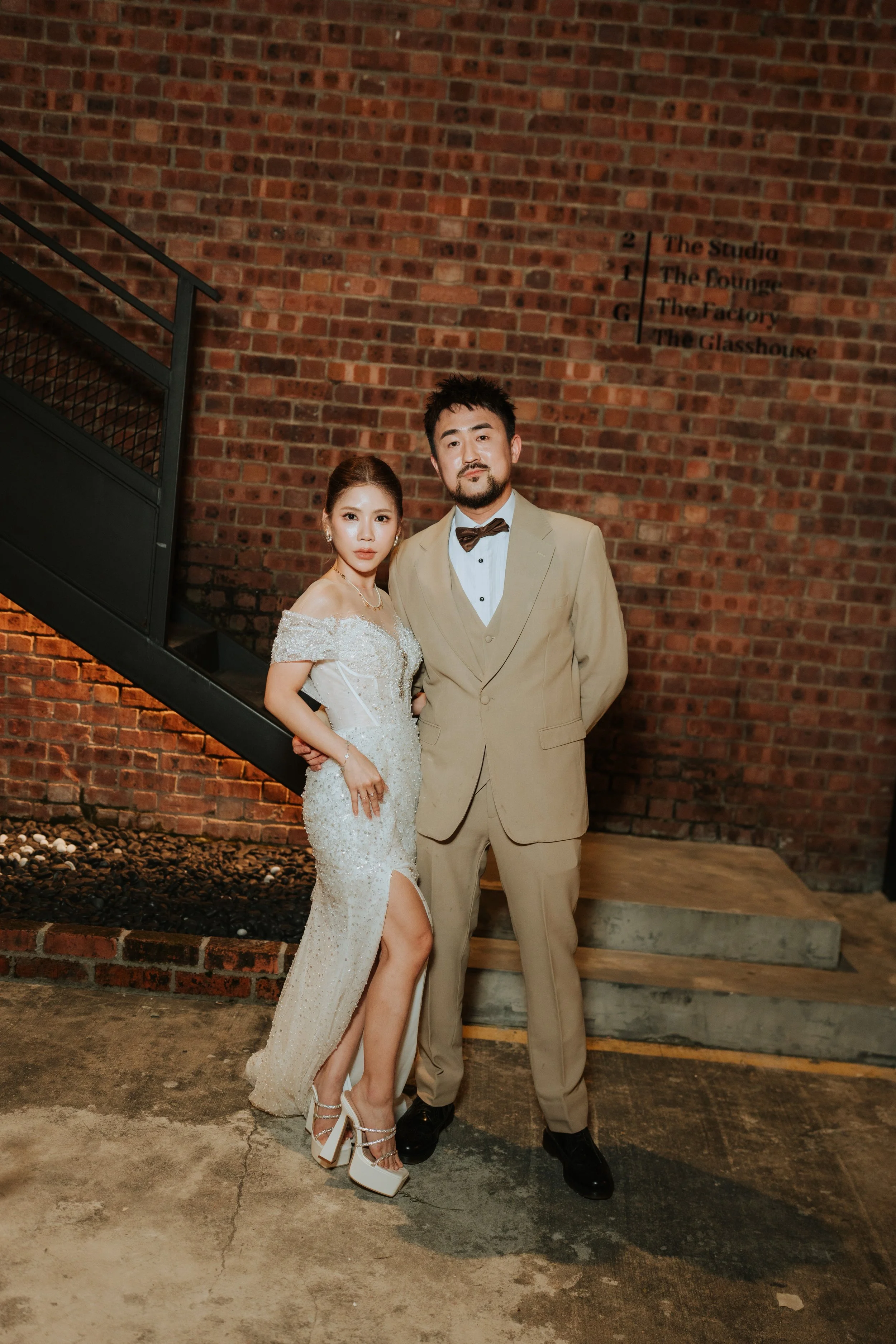 A bride in an off-shoulder white wedding dress with a slit and high heels, and a groom in a beige suit with a bow tie, standing together in front of a brick wall with a staircase nearby.