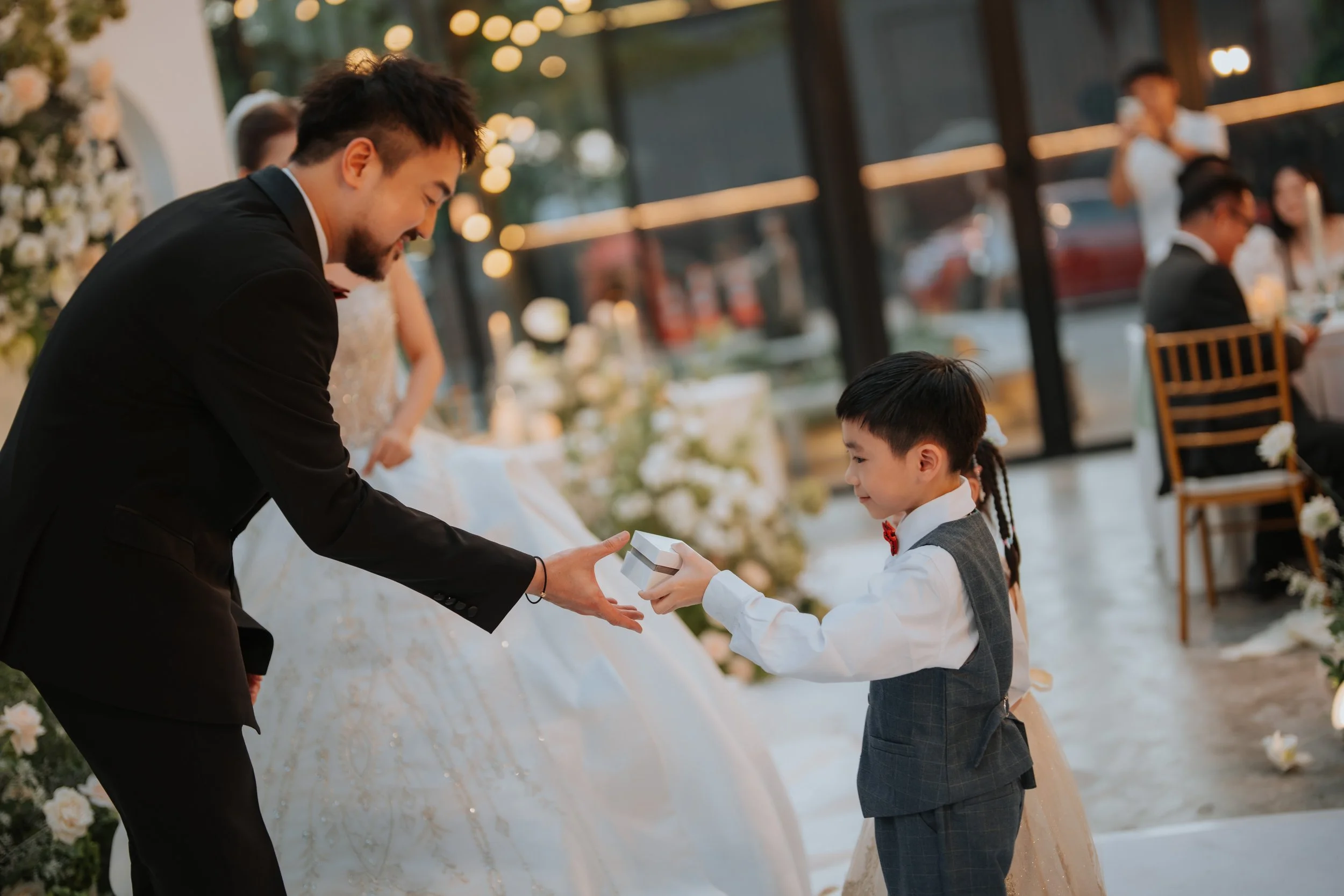 A young boy dressed in a vest and dress shirt is handing a small gift to a man in a tuxedo during a wedding celebration.