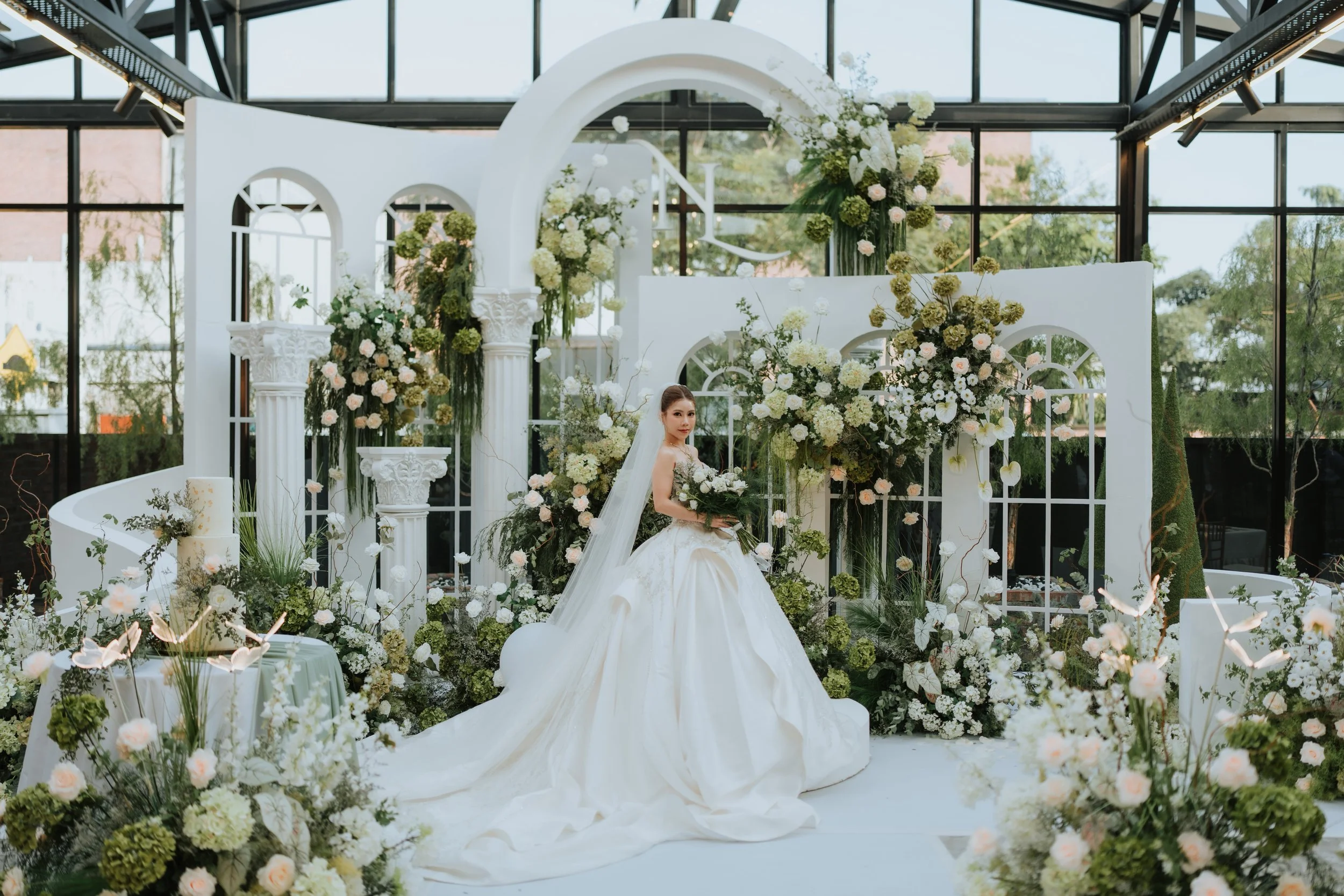 Bride in white wedding gown holding bouquet, standing amidst white and green floral decorations and classical columns at a wedding venue with glass ceiling.