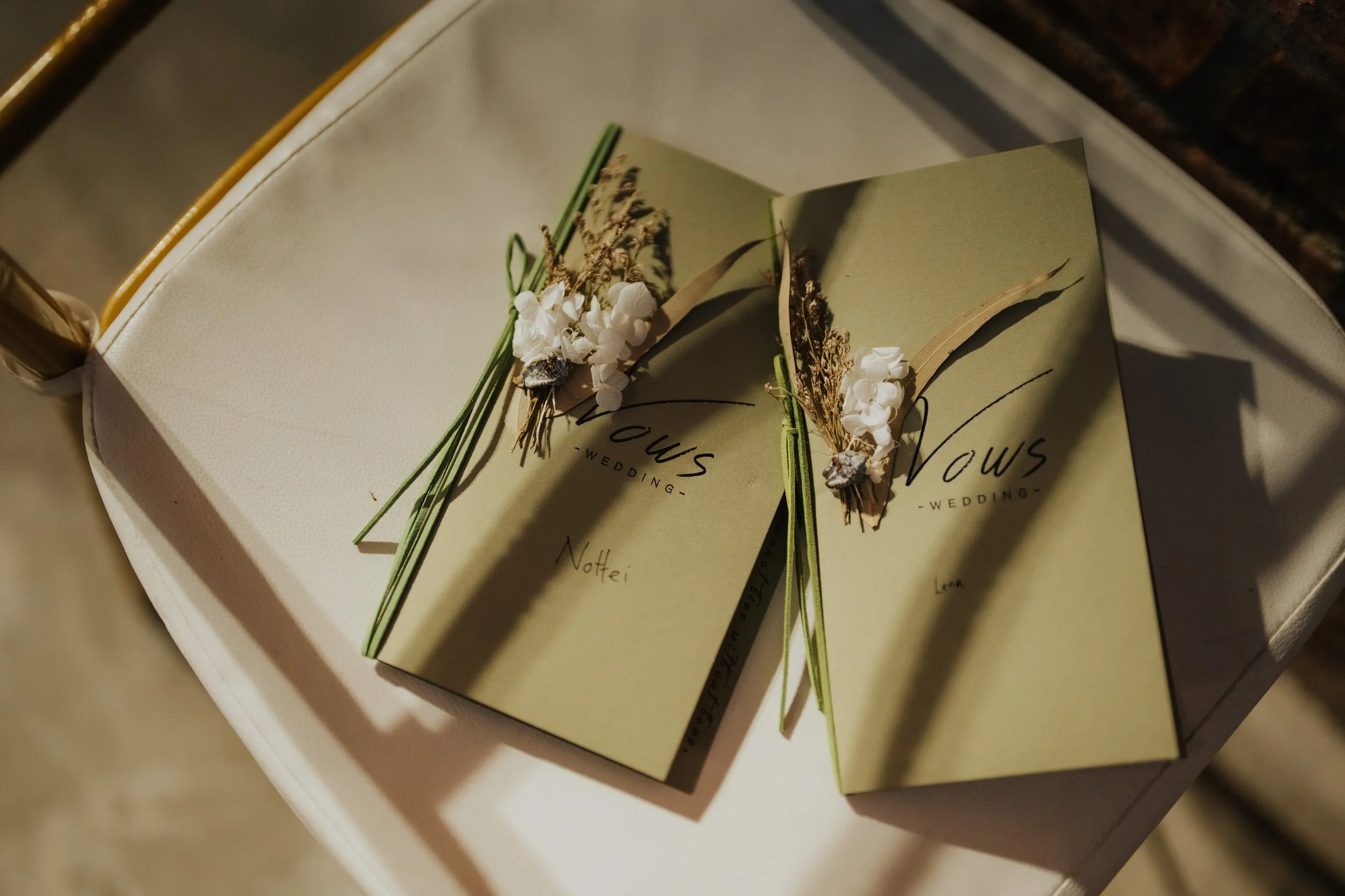 Two wedding notebooks with floral embellishments on a white chair.