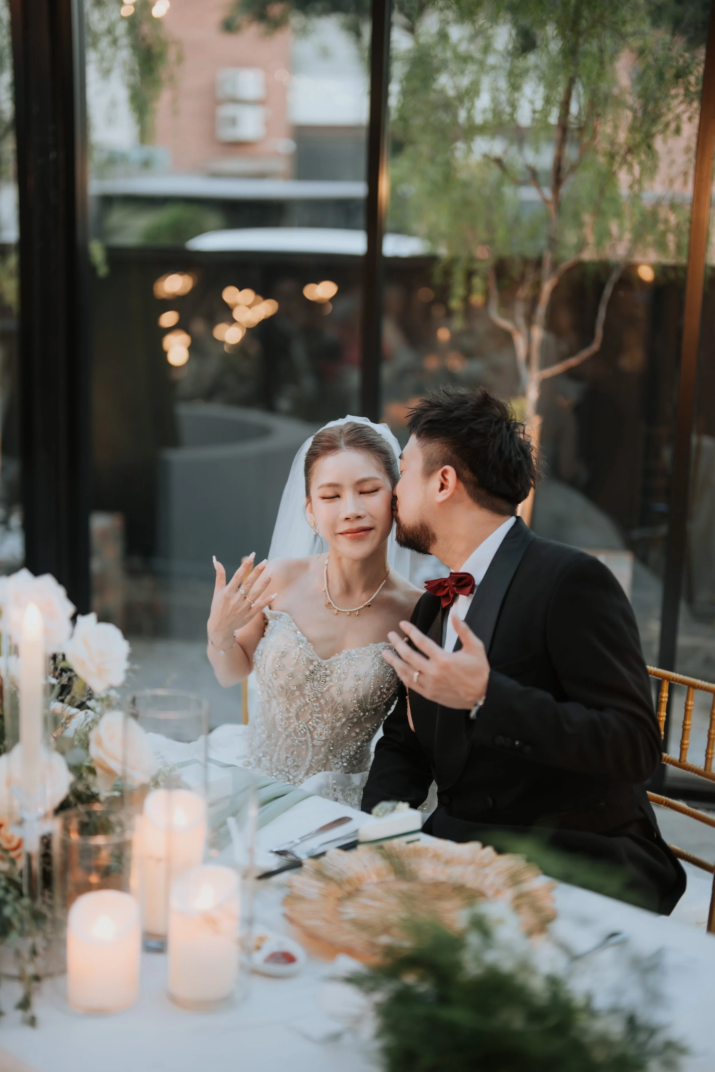 A bride and groom sitting at a wedding reception table, with the groom kissing the bride on the cheek, surrounded by candles and wedding decor.