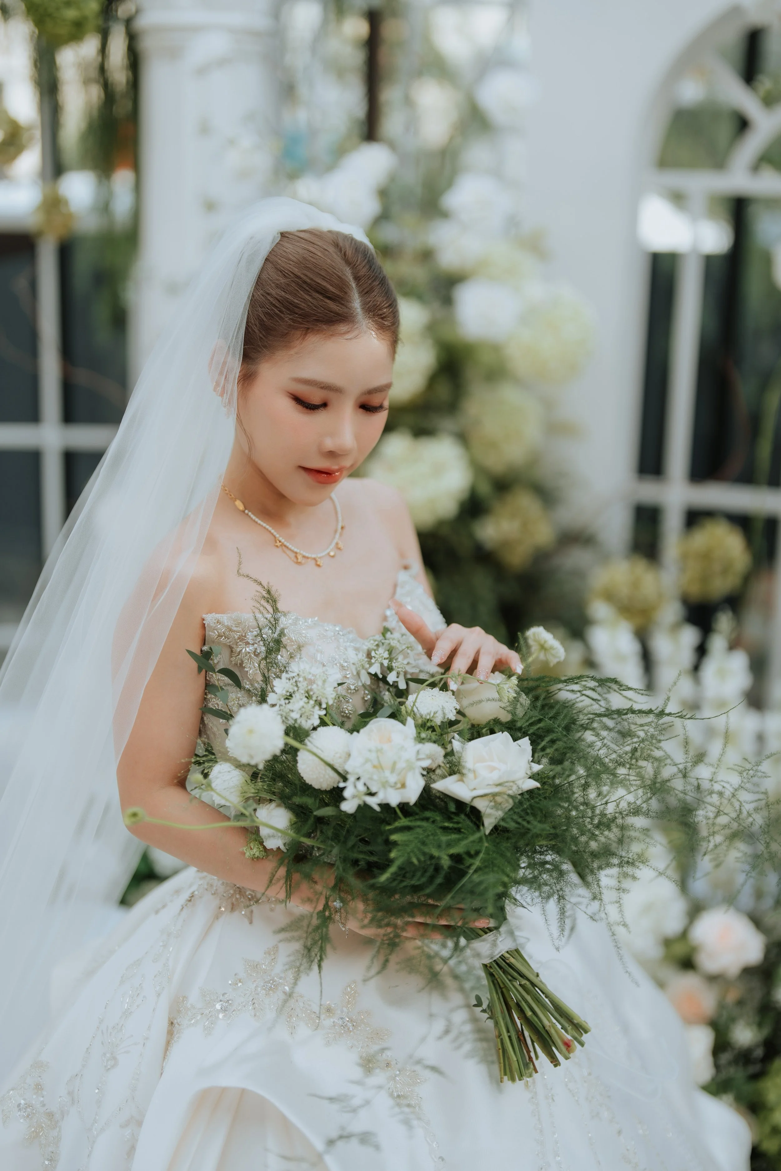 A bride in a white wedding dress holding a bouquet of white flowers, standing in front of a floral backdrop.